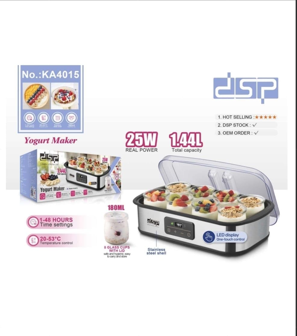 Bërëse Kosi DSP KA4015 me 8 gota qelqi, 1.44L dhe 25W. Kontroll temperature 20–53°C dhe kohëmatës 48 orë për kos të freskët dhe natyral.