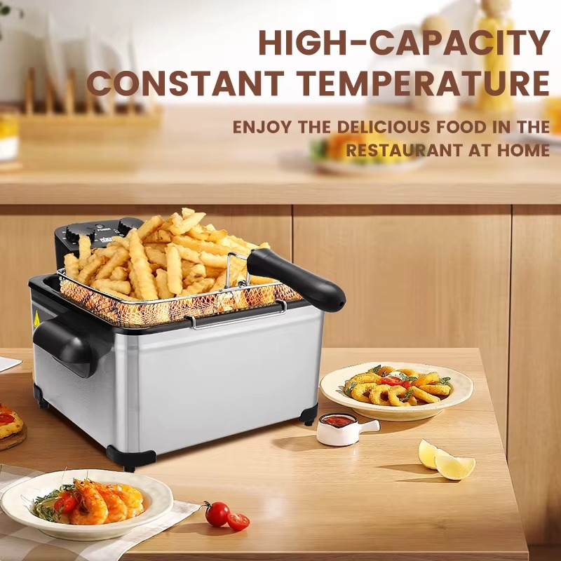 Kjo fritezë profesionale ka tre shporta skuqjeje (një e madhe dhe dy të vogla), ideale për përgatitje të ndryshme në të njëjtën kohë. Termostati i rregullueshëm (130°C–190°C) ju lejon të përshtatni temperaturën sipas llojit të ushqimit, ndërsa timera 60-minutësh siguron kontroll të plotë të kohës së pjekjes.