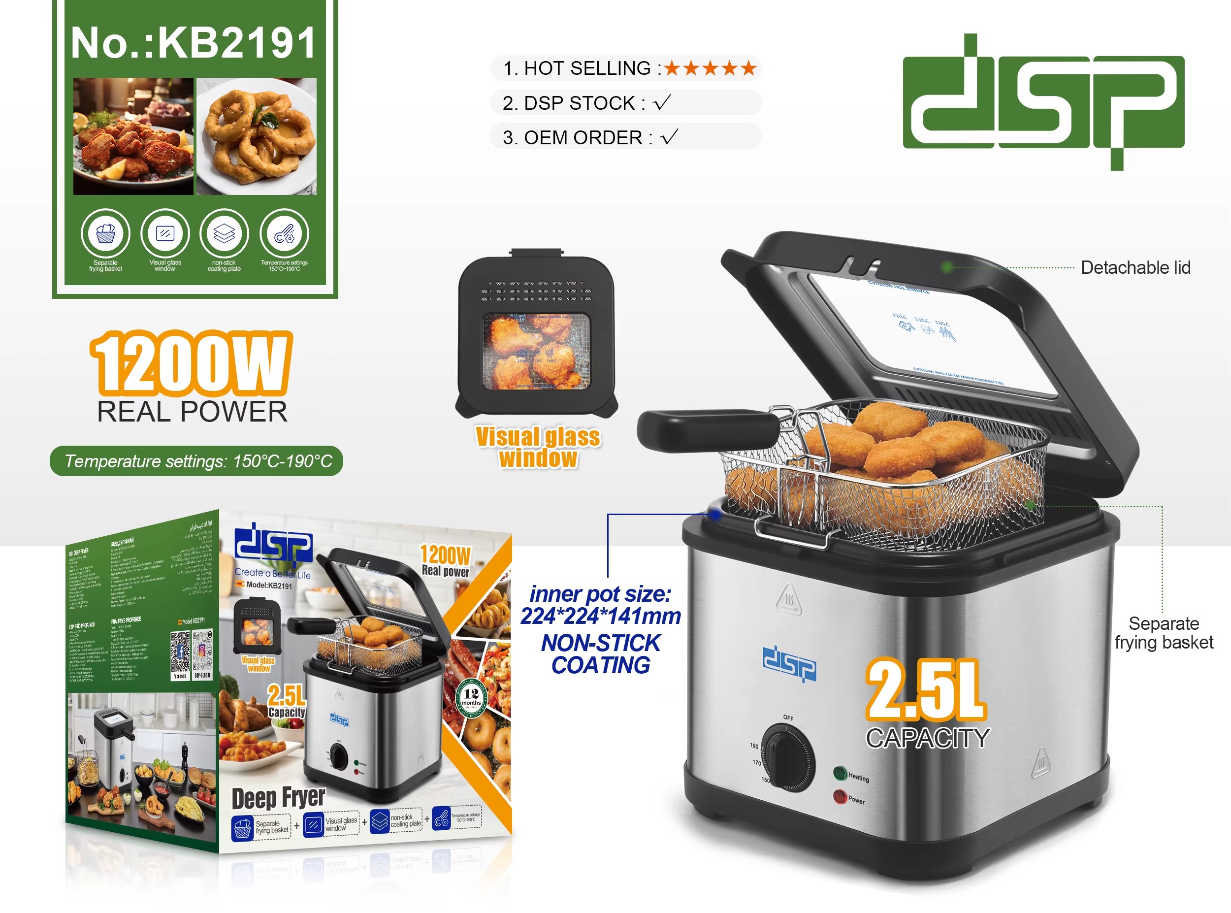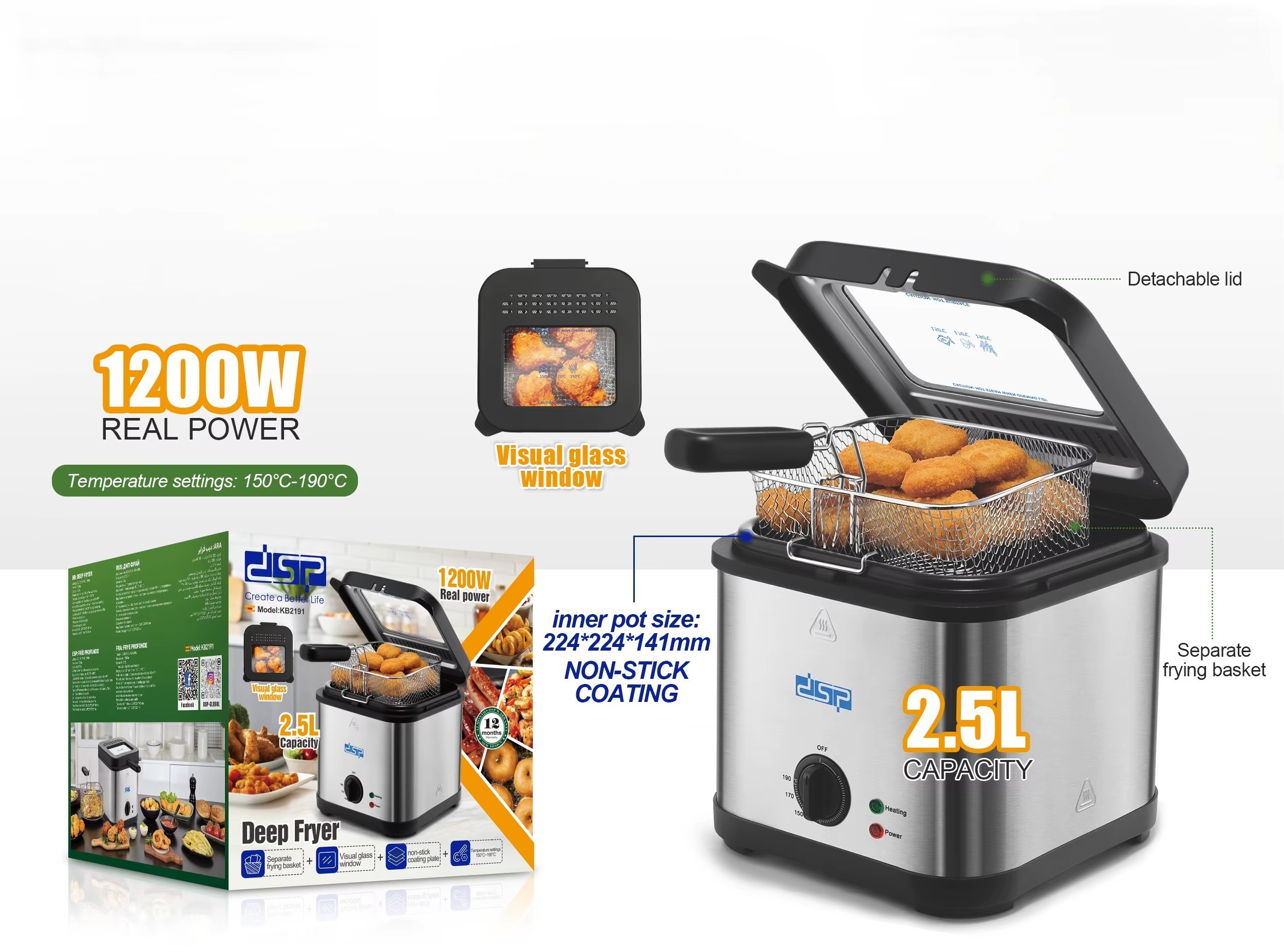 Fritezë Elektrike DSP KB2191 2.5L 1200W me dritare xhami, termostat të rregullueshëm dhe kosh jo-ngjitës. E përkryer për skuqje të shpejta dhe krokante.