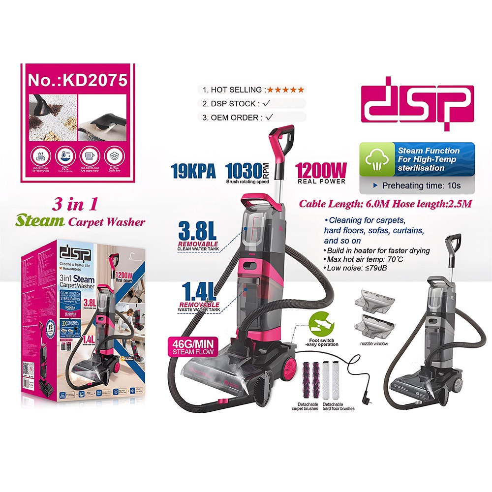 Fshesë me Avull & Larje 3 në 1 DSP KD2075 me fuqi 1200W, presion 19KPA dhe depozita të dyfishta, pastron, thith dhe sterilizon me avull për rezultate profesionale në shtëpi.