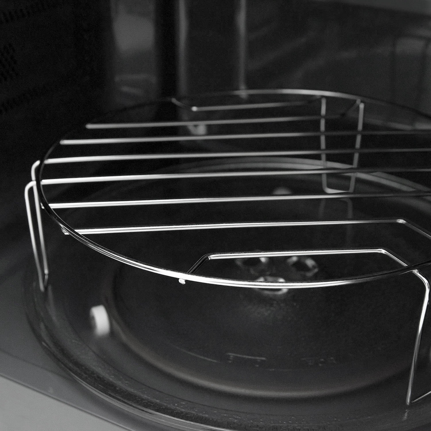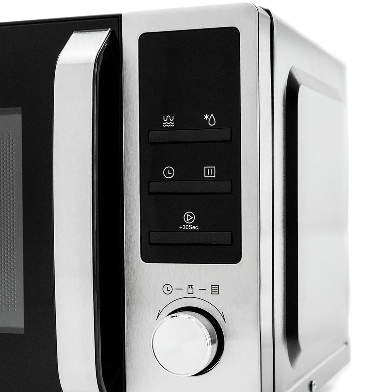 Dizajni është i punuar me kujdes. Kombinimi i çelikut inox me xhamin e zi i jep pajisjes një pamje elegante dhe moderne. Doreza dhe paneli i kontrollit prej çeliku inox garantojnë qëndrueshmëri dhe jetëgjatësi. Kjo mikrovalë përshtatet në çdo hapësirë kuzhine dhe është e lehtë për t’u përdorur falë peshës së saj vetëm 11.1 kg.