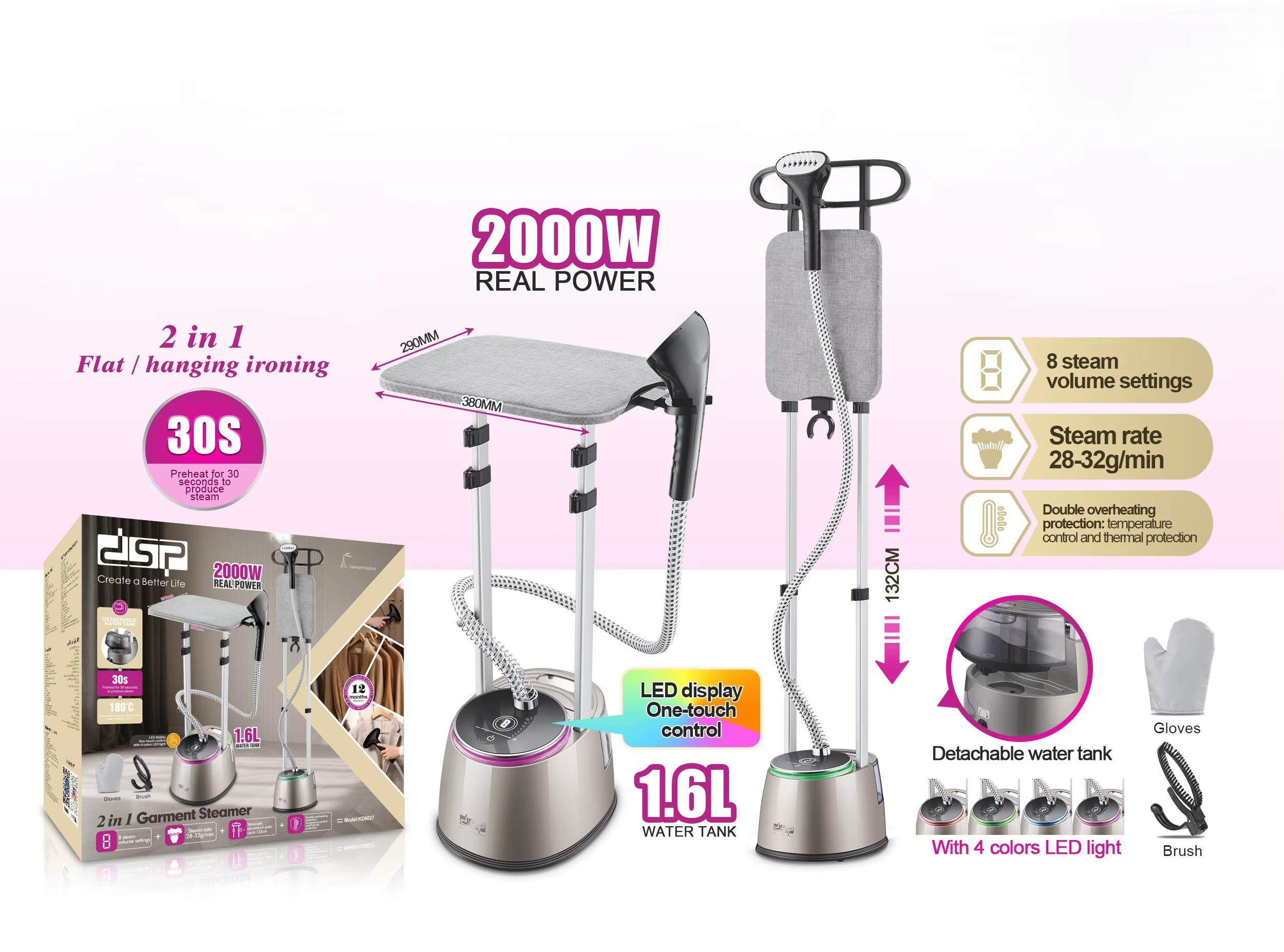 Hekuri me avull DSP KD6027 është një pajisje profesionale 2 në 1 që kombinon funksionin e hekurosjes klasike në tavolinë me avullimin vertikal për rroba të varura. Me fuqi 2000W dhe sistem të avancuar avulli, ai ofron rezultate të shpejta dhe të përsosura në çdo pëlhurë.