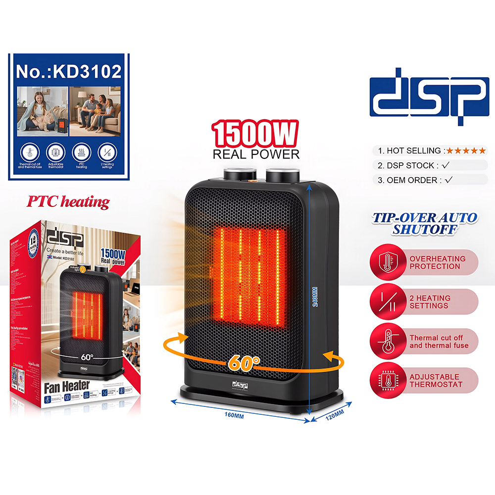 Ngrohës PTC DSP KD3102 është një ngrohës modern, kompakt dhe shumë efikas, i krijuar për të ofruar nxehtësi të shpejtë dhe të sigurt gjatë ditëve të ftohta. Ngrohës PTC DSP KD3102 përdor teknologjinë e avancuar PTC, e cila nxehet menjëherë dhe shpërndan nxehtësinë në mënyrë uniforme. Performanca e tij është e qëndrueshme dhe e sigurt, sepse elementët PTC nuk mbinxehen dhe ruajnë temperaturën në mënyrë inteligjente.