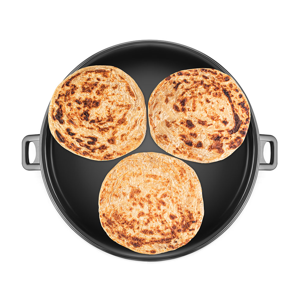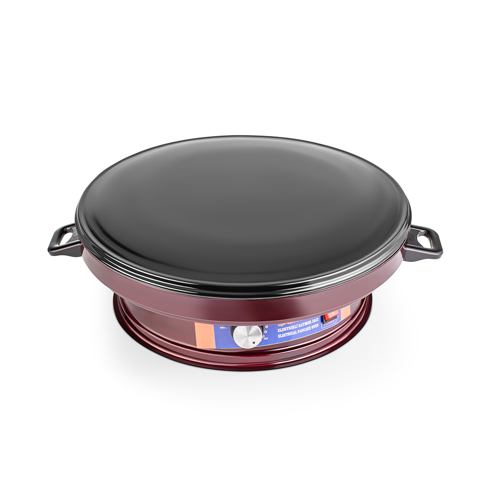 Temperatura rregullohet nga 50°C deri në 300°C, duke të lejuar të përgatisësh produkte shumë të ndryshme – nga petët tradicionale, deri te katmerët turq, bazat e picës, apo ushqime të tjera që kërkojnë nxehtësi të saktë. Rregullatori termostatik mban temperaturën konstante, kështu që rezultati është gjithmonë i njëjtë: i pjekur mirë, pa djegie dhe pa zona të ftohta.