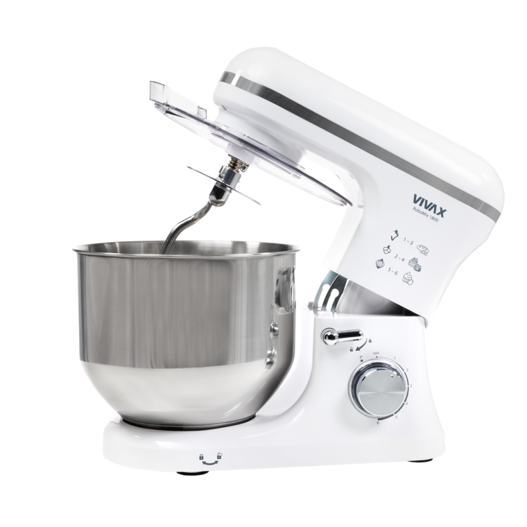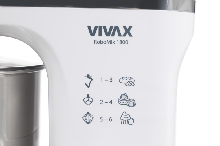 Robot Mikser VIVAX RM-71800WH me motor 1800W, 6 shpejtësi dhe Turbo Pulse. Përfshin rrahës, përzierës për krem dhe brumë, me dizajn elegant Inox.