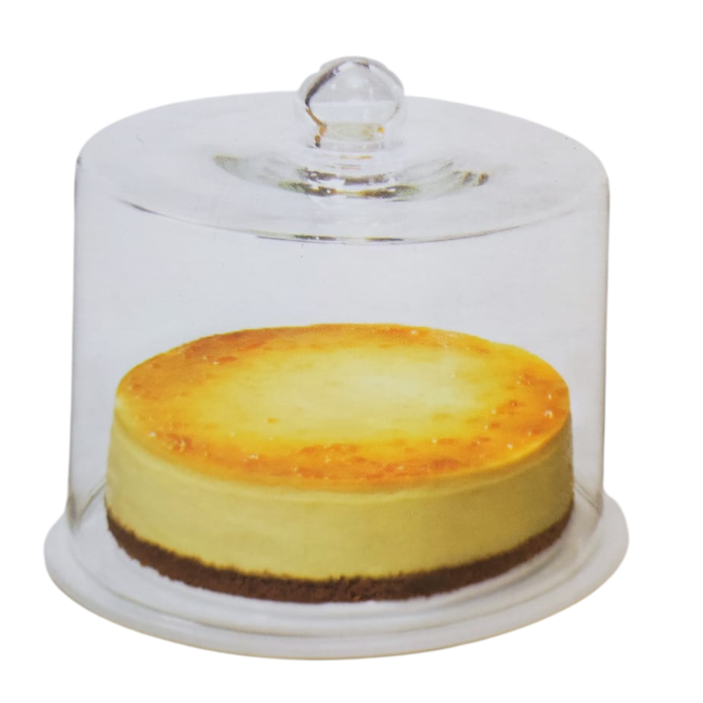 Kupola prej qelqi ka dizajn të pastër dhe modern. Ajo mbron ëmbëlsirën nga pluhuri, tharja dhe aromat e tjera të kuzhinës. Është ideale për ruajtje, frigorifer ose servirje në festime. Qelqi është i trashë dhe i sigurt për përdorim të përditshëm.