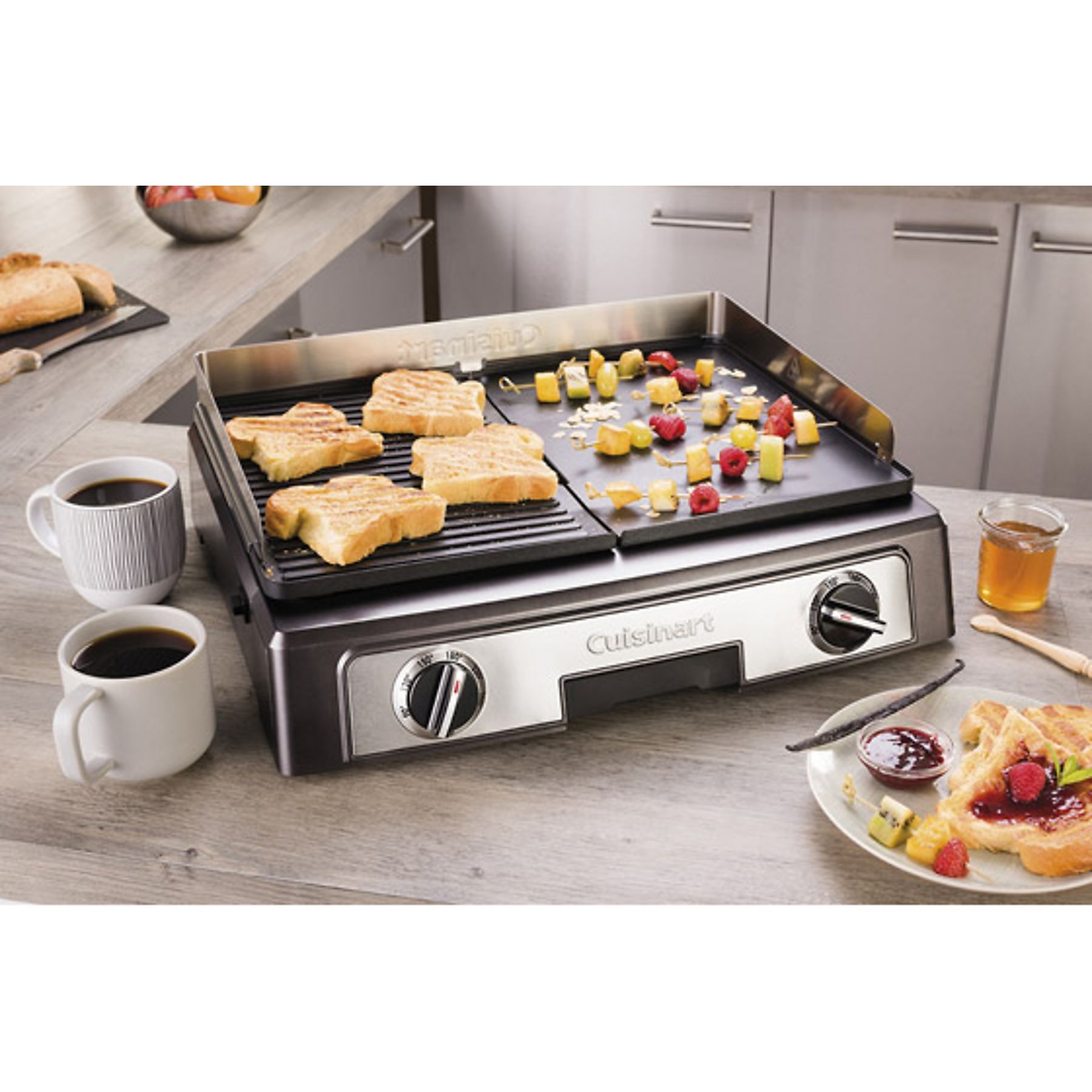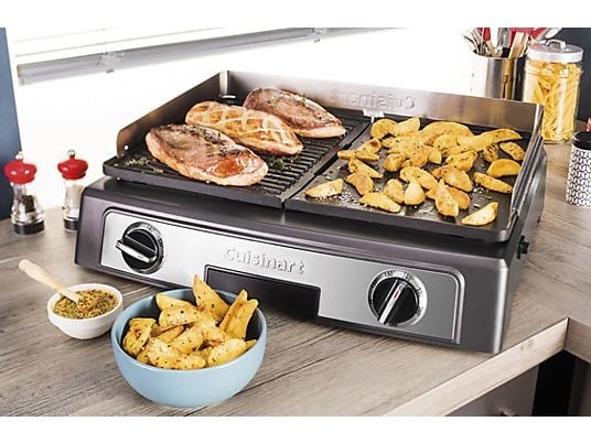Me dy pllakat e tij të lëvizshme, pjaster dhe grill, ju mund ta përdorni për pothuajse të gjitha llojet e mishit të pjekur në skarë, peshkut ose recetave të shijshme të skuqura me perime.